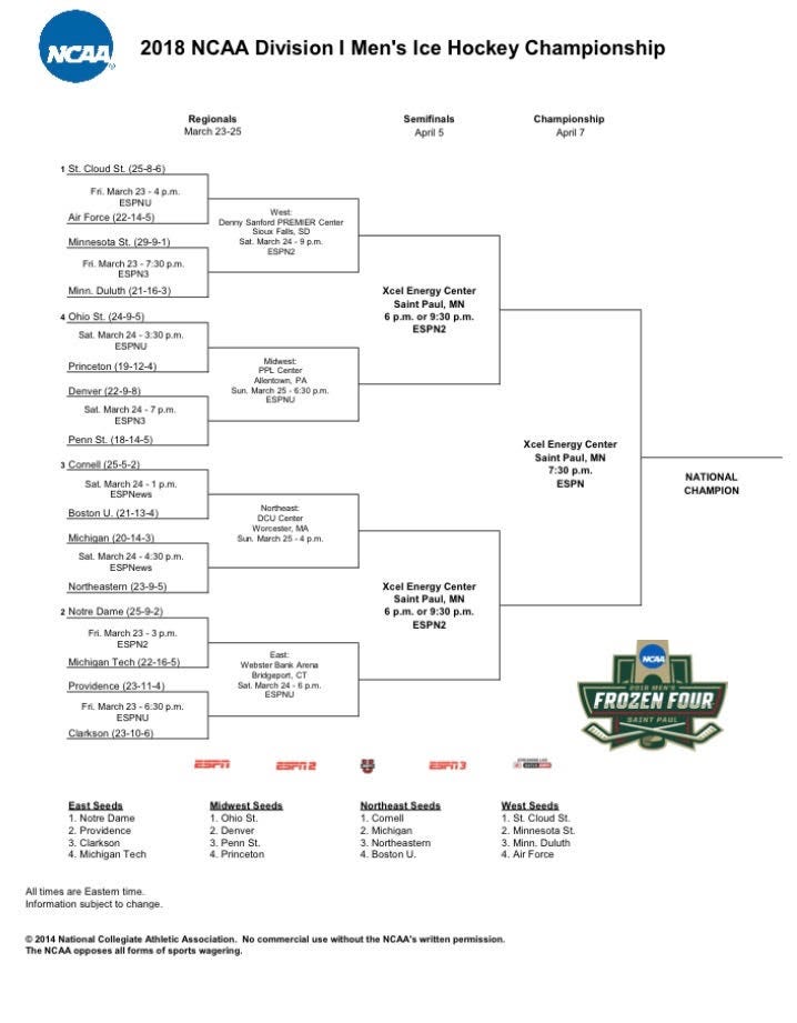 First round march 13 quarterfinals march 20 semifinals march 26 championship march 27 future sites. Ncaa hockey schedules and results on espn.com. Here is the official, printable ncaa di men's ice hockey tournament. The 21 longest college hockey games in men's di tournament history; 1 seed meets the region's no.